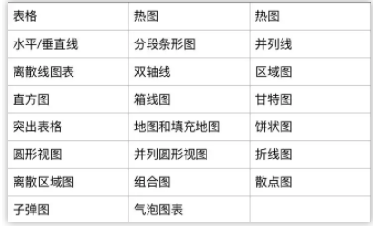 1.可视化类型Tableau提供了以下标准(可拖放)可视化元素: