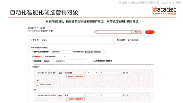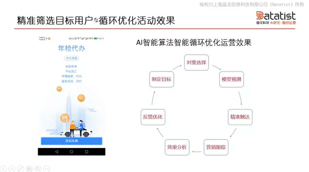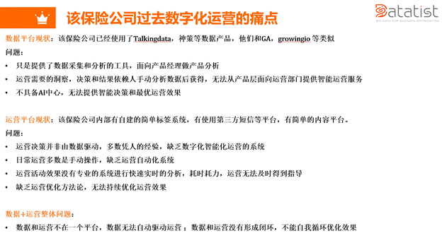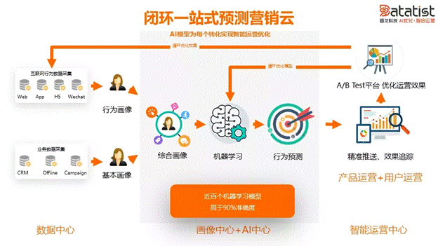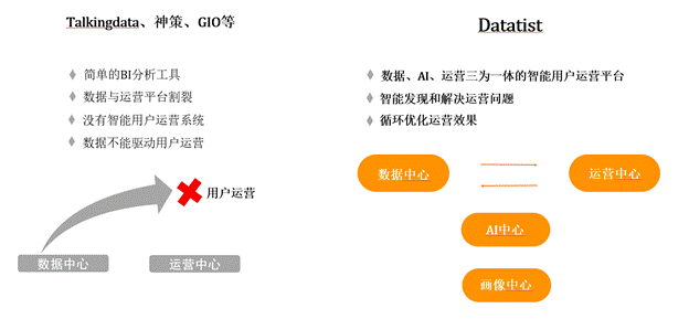 Datatist 是基于以上的痛点,真正将数据和运营打通,并且创造了AI运营大脑,在营销自动化之外更可以进行营销智能化的产品,并且既有面向2C消费者的又有面向2B采购商渠道商智能运营的系统。