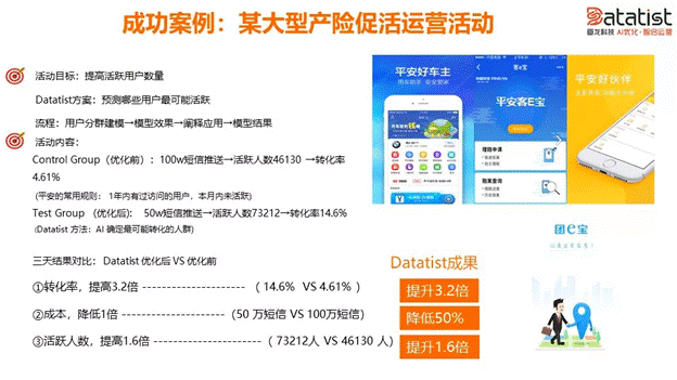 这两个活动开出去之后,三天时间就看到了差距。AI促活优化,发了50万条短信,活跃了7万人,转化率为14.6%。传统优化,虽然推送了100万条短信,但仅活跃4万多人,转化率为4.61%。