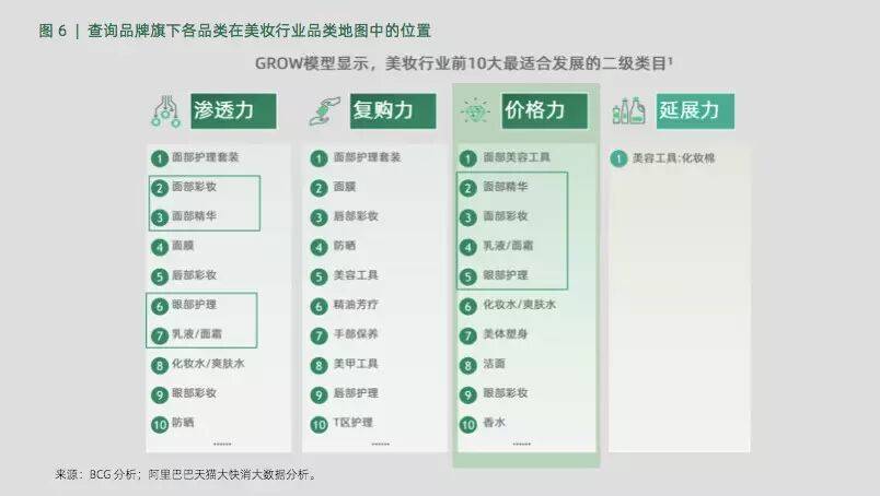 渗透力(Gain): 指消费者购买更多类型品类 / 产品对品牌总增长机会的贡献; 复购力(Retain): 指消费者更频繁 / 重复购买产品对品牌总增长机会的贡献; 价格力(bOOst): 指消费者购买价格升级产品对品牌总增长机会的贡献; 延展力(Widen): 指品牌通过提供现有品类外其他关联类型产品所贡献的总增长机会。
