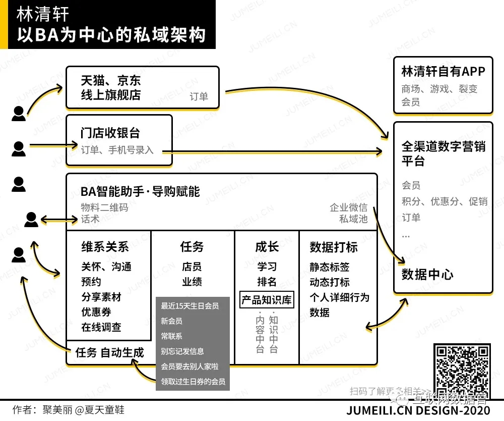 作为有着连锁实体店的林清轩,之前通过第一种方法沉淀的私域会员池就成了自救的基础。聚美丽团队深度剖析了其正在持续迭代中的“新零售”系统,发现这套系统的精髓是以门店BA为中心的“智能导购”模块所支持的私域日常运营: