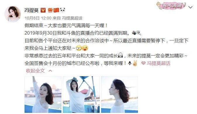 2019年9月30日,在与斗鱼解约之后,冯提莫会被哪个平台招致麾下,成为众人密切关注的话题。此时的冯提莫已经拥有上千万的直播粉丝,不断参加圈外活动,转型的心思路人皆知。