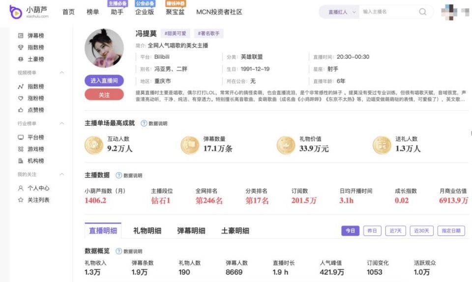 从红人一站式服务平台小葫芦的数据来看,冯提莫现在全网主播排名246名,分类排名第17,月商业估值在6913万,与排行榜前几位的张大仙、二驴的6点直播、旭旭宝宝已经拉开差距。