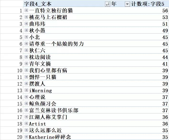 类型看:前20名,无一例外全是跟心灵或者情感类的有关。也好理解,靠信任关系卖货,就是大型微商。很多个人职场能力提升号的粉丝对号主本人有一定崇拜和信任心里,所以号主说的会有很大的吸引力~