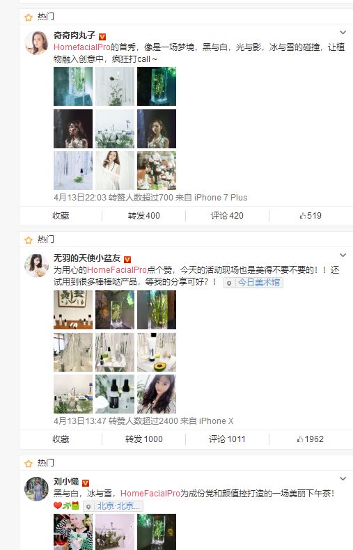 微博是HFP的营销阵地。共有100多个拥有百万粉丝的KOL对HFP的产品进行了推荐。HFP微博目前共有4万余粉丝,内容套路基本上是先找一个故事作为切入点,然后就开始介绍产品,再加上这些大V的亲身体验,最后也是最切中粉丝要害的“优惠福利”。微博首页点赞浮现内容均为高质量买家秀,配图精美。微博关键词搜索多为粉丝种草,买家秀等好评展现形式宣传,对于品牌潜在用户可起到一定种草,转化作用。