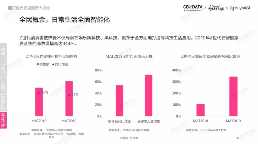 你只知Z世代爱娱乐,殊不知他们对“科技”有着超群的求知欲。CBNData《报告》显示,互联网是Z世代获取科技类资讯的主要渠道,而除了爱“云”学习,他们更热衷于在日常生活中实现科技产品的应用。不仅限于“硬核科技产品”“无人机”等科技单品的热销,2019年Z世代在智能家居系统的消费增幅高达344%,呈现Z青年对全面智能化生活的追求。