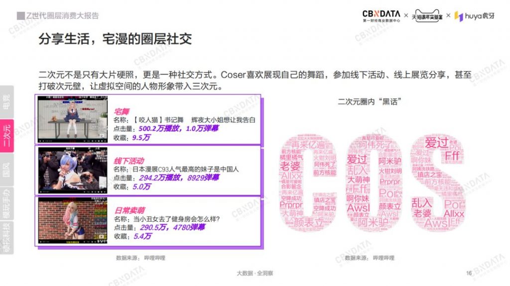 此外,二次元的Coser文化也不再仅限于大片硬照,随着线上社交形式的日渐丰富,宅舞、线下活动、日常生活等视频内容开始广泛传播,虚拟空间的人物形象逐渐打入三次元。