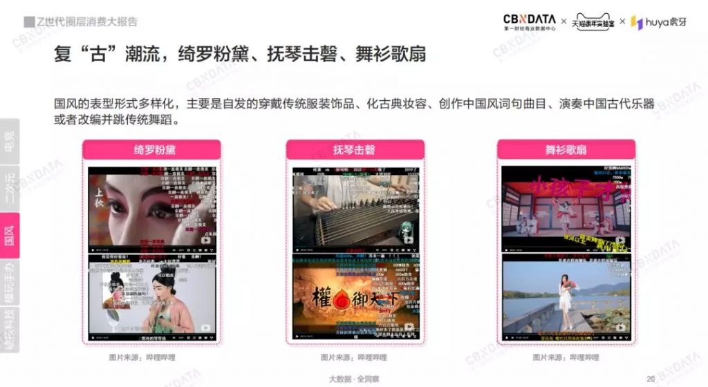 从线上数千万的传统文化爱好者齐聚B站,到共青团中央等大型机构纷纷在线下举办国风主题活动,足见国风之潮正当时。CBNData《报告》显示,B站上近乎九成的国风爱好者都是Z世代,从穿戴传统服装饰品、化古典妆容、创作中国风词句曲目、演奏中国古代乐器,到改编并跳传统舞蹈,国风的表型形式多种多样。
