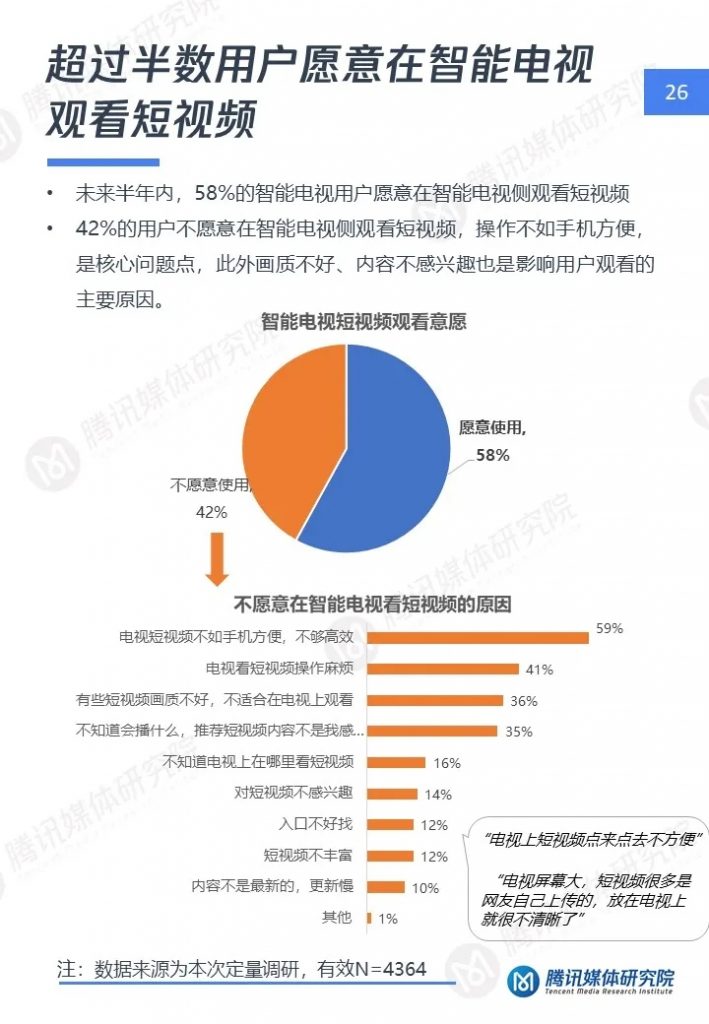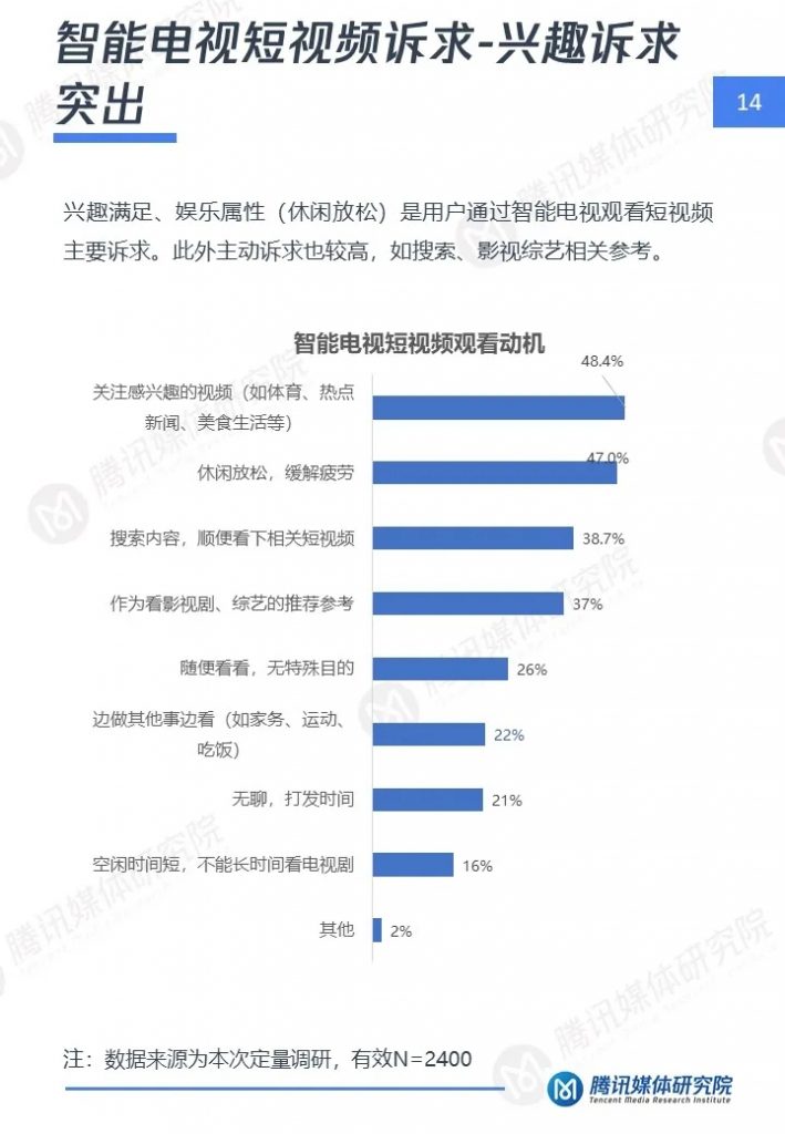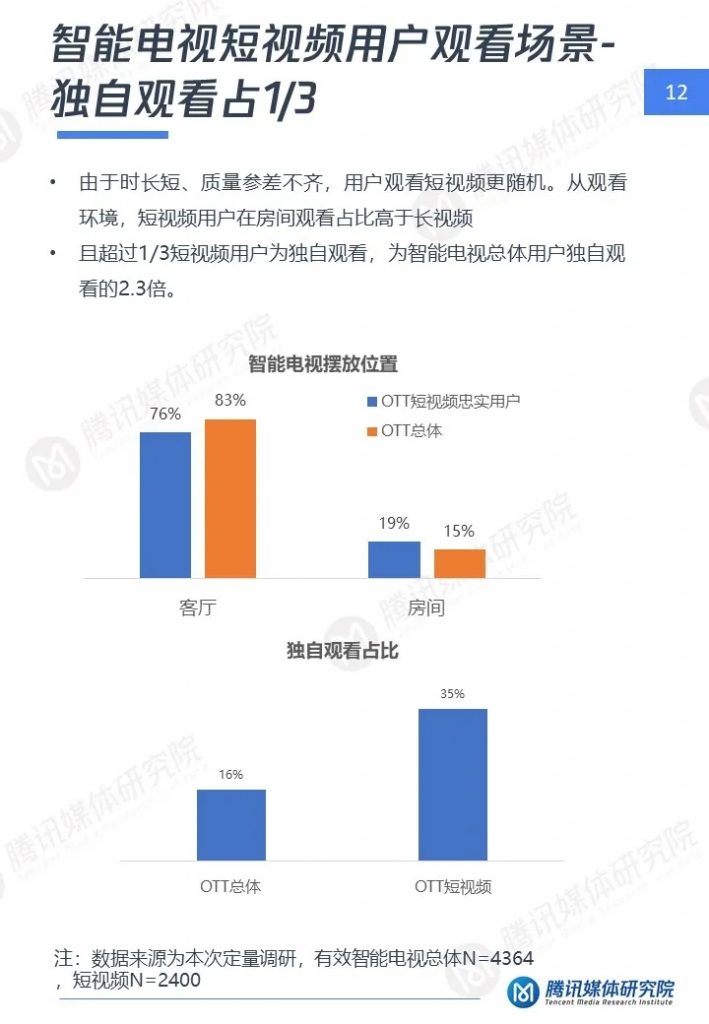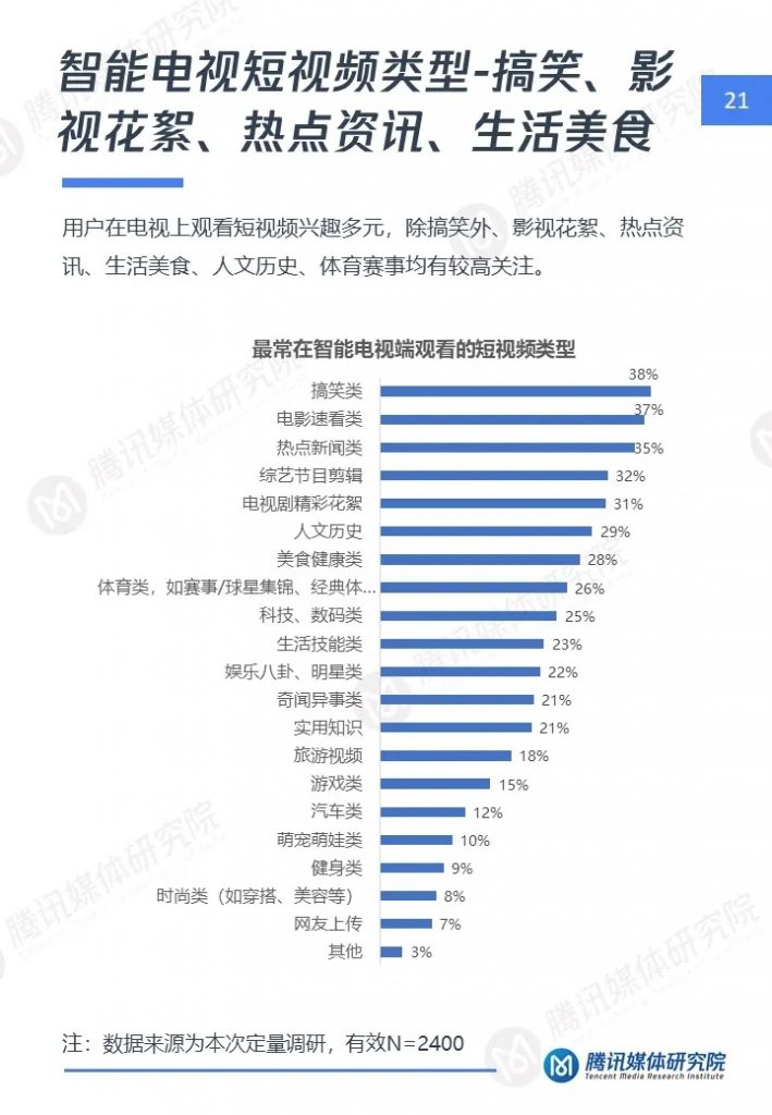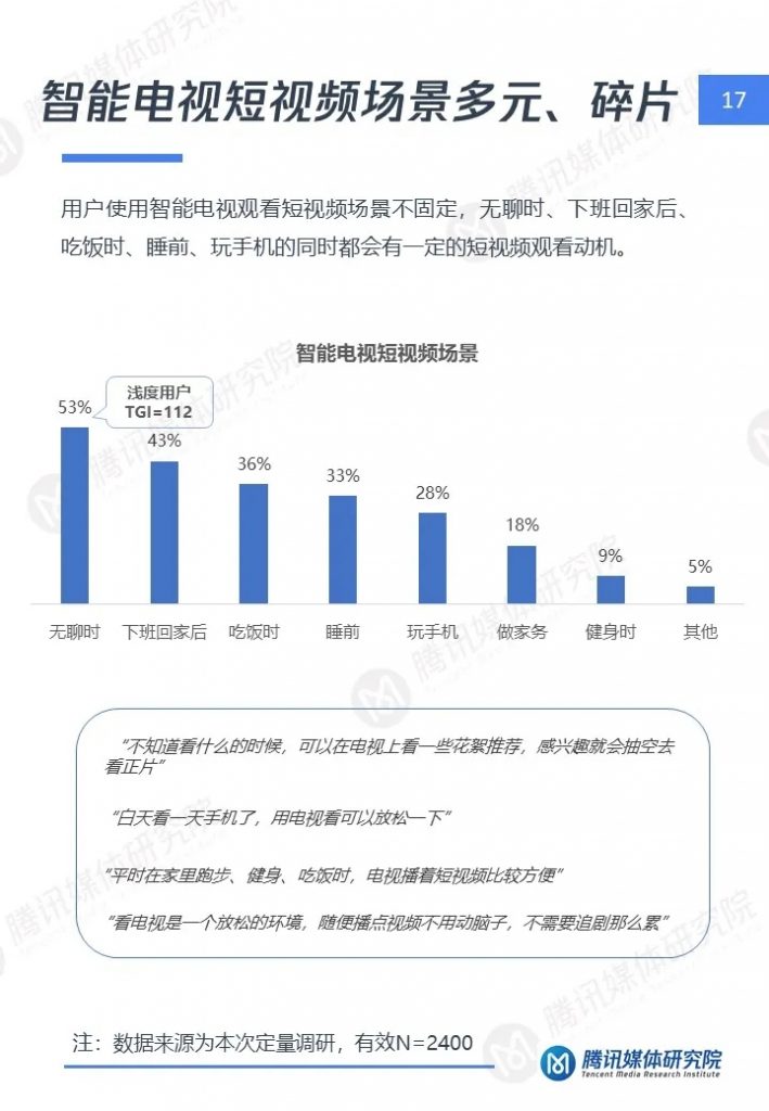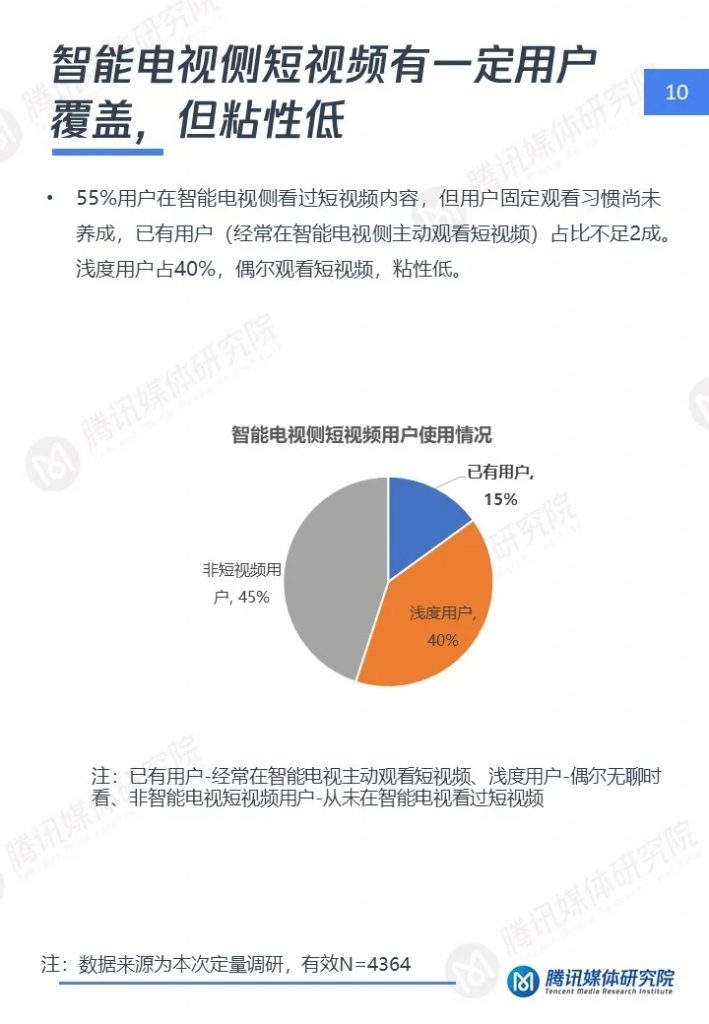 腾讯媒体研究院联合酷鹅俱乐部特开展智能电视侧短视频专项研究,通过定性访谈、定量问卷调查等方式,分别从智能电视侧短视频用户画像、用户行为及机会点三个维度,解读用户在大屏上的短视频消费行为与行业机会点,以下为报告全文。