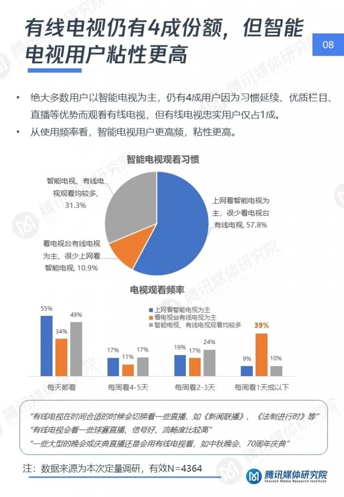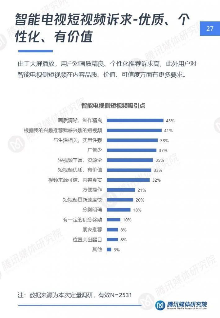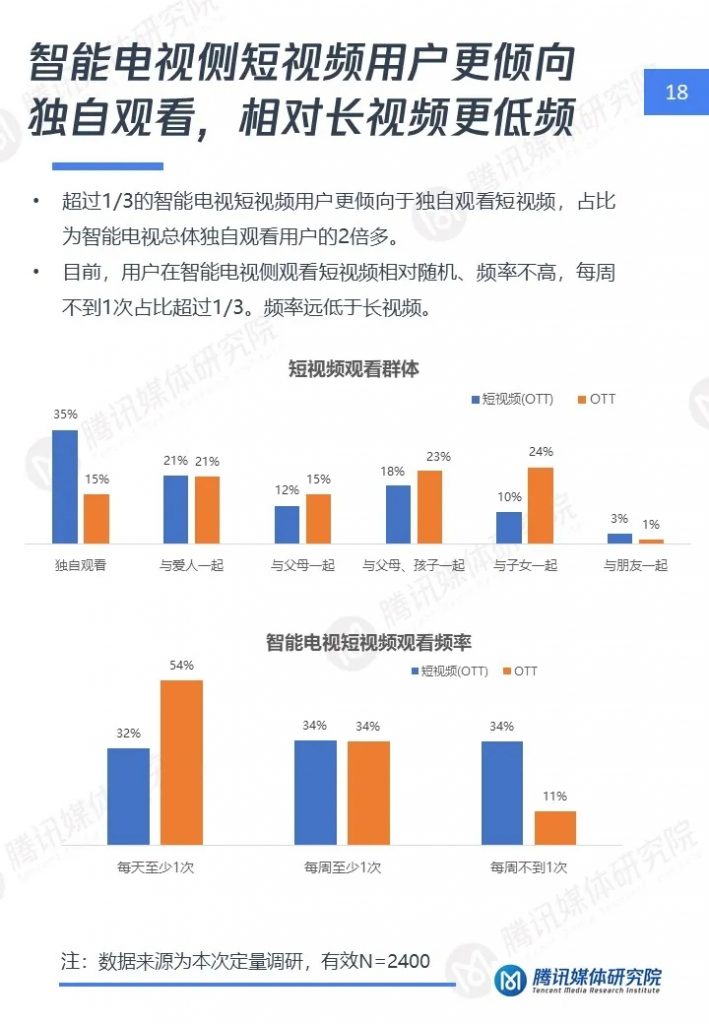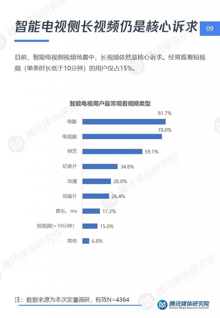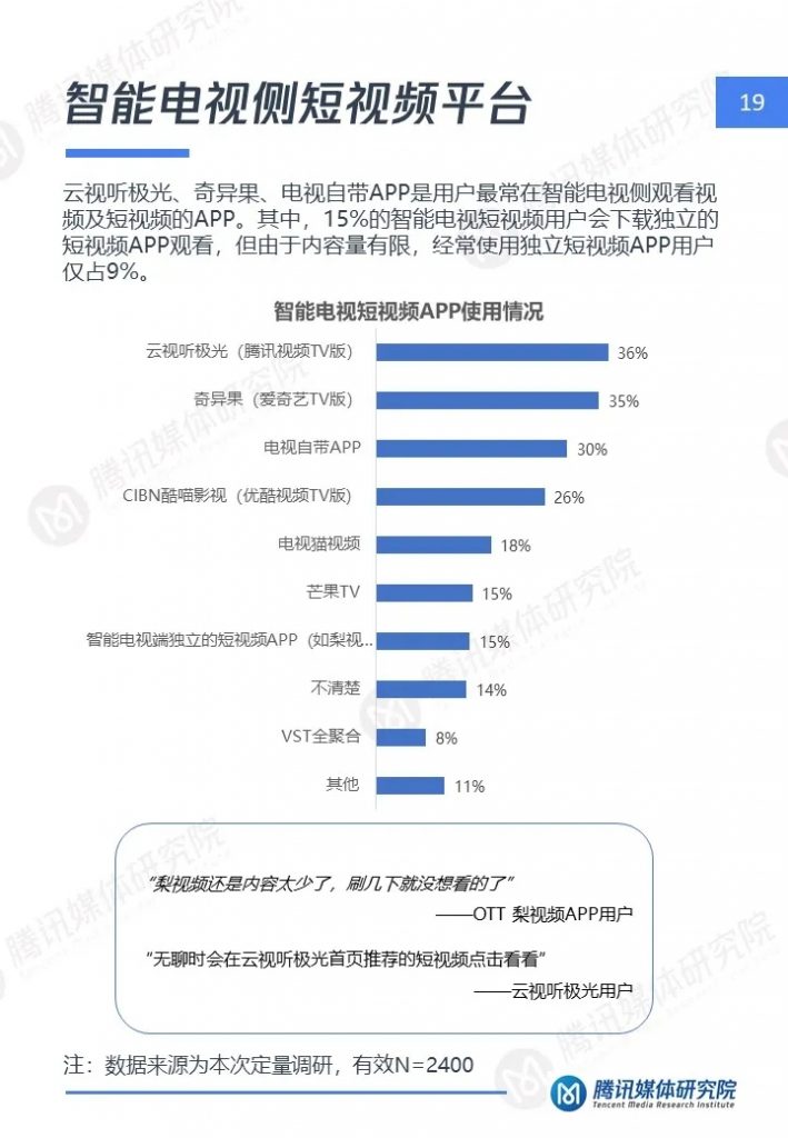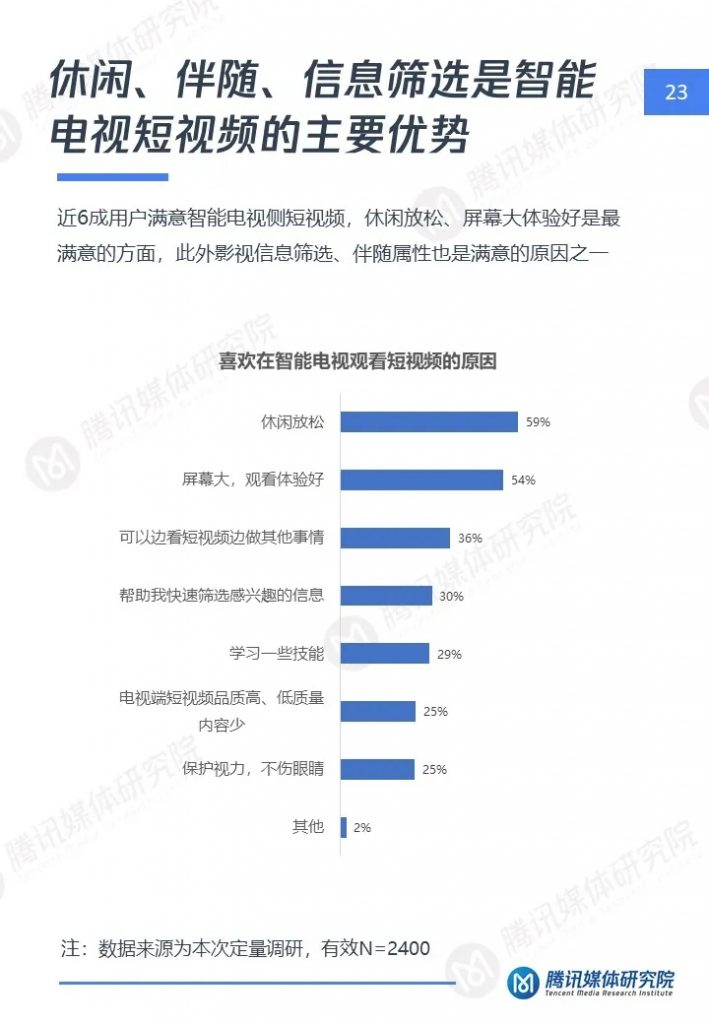腾讯媒体研究院联合酷鹅俱乐部特开展智能电视侧短视频专项研究,通过定性访谈、定量问卷调查等方式,分别从智能电视侧短视频用户画像、用户行为及机会点三个维度,解读用户在大屏上的短视频消费行为与行业机会点,以下为报告全文。
