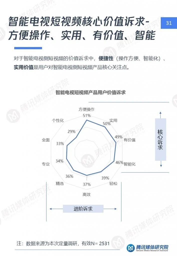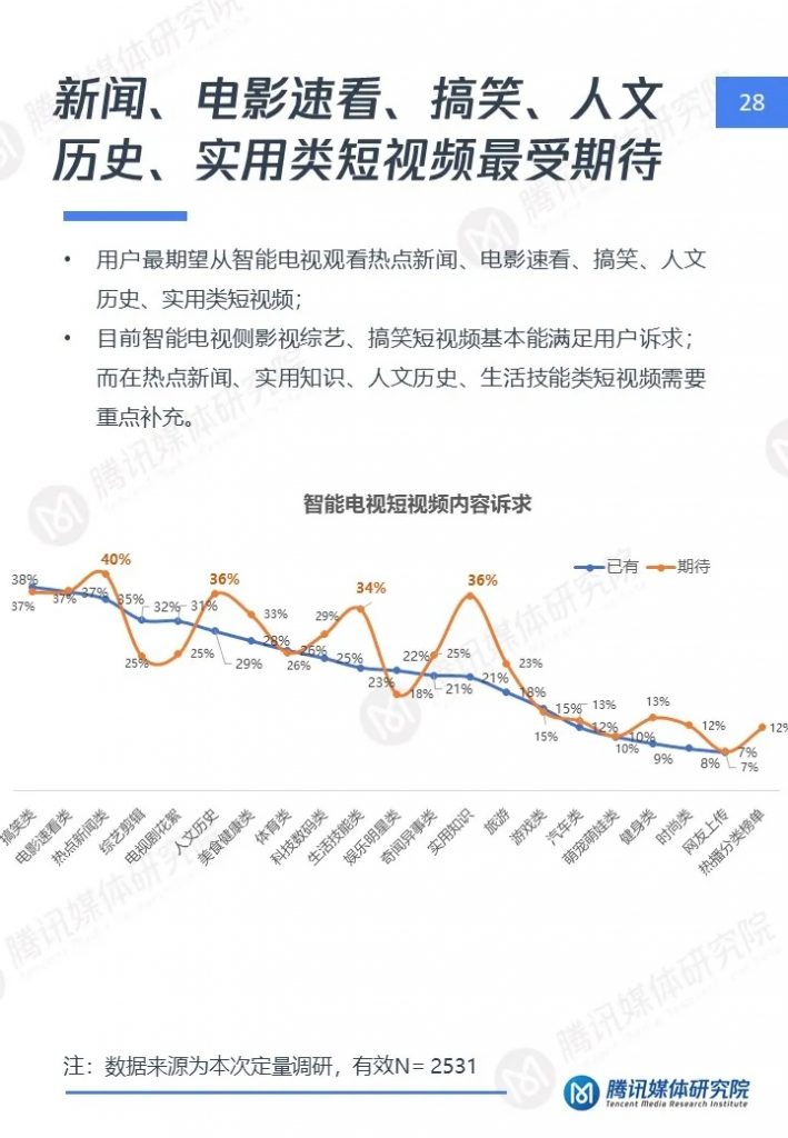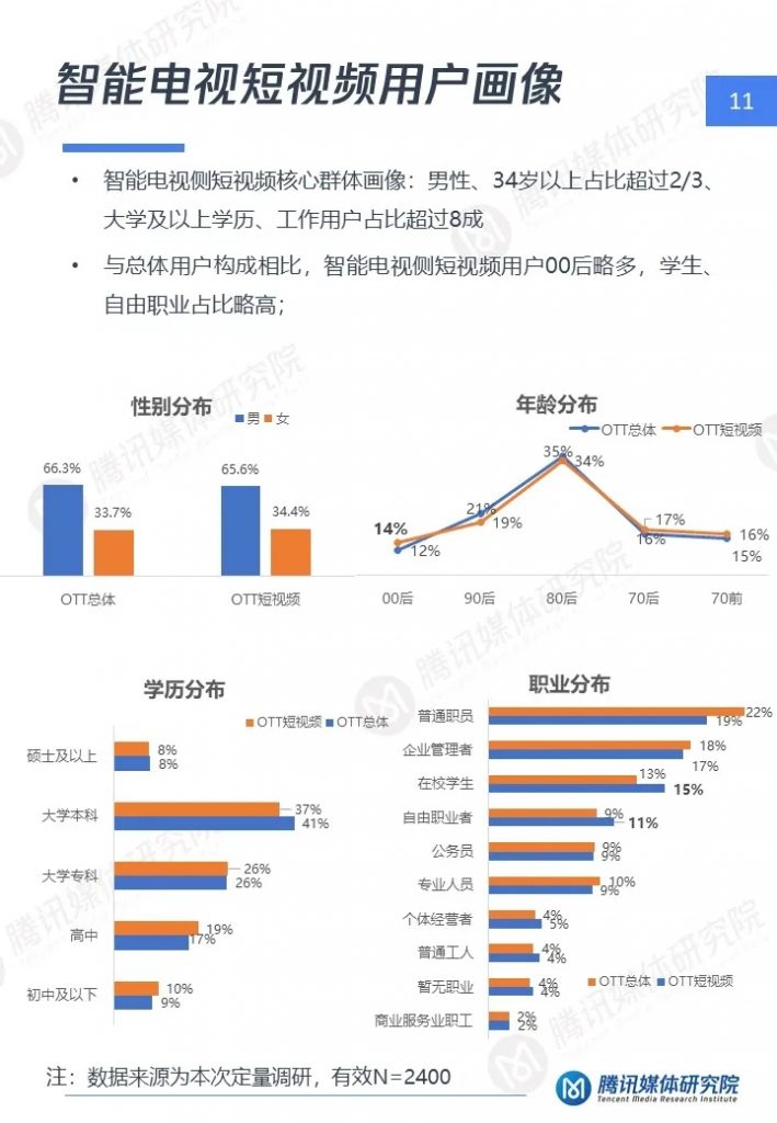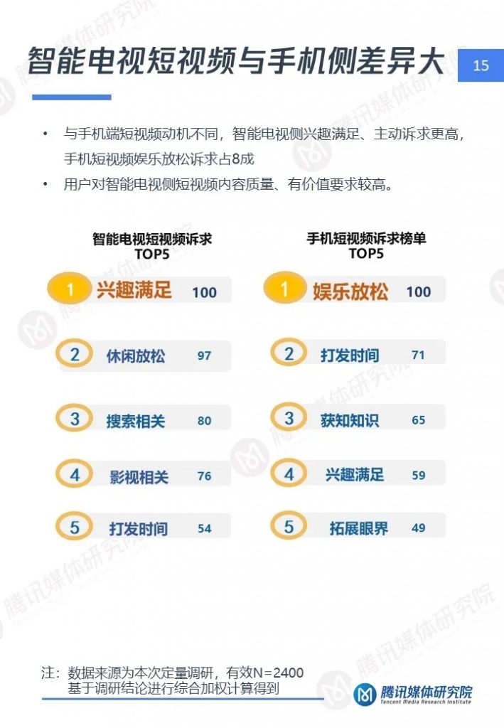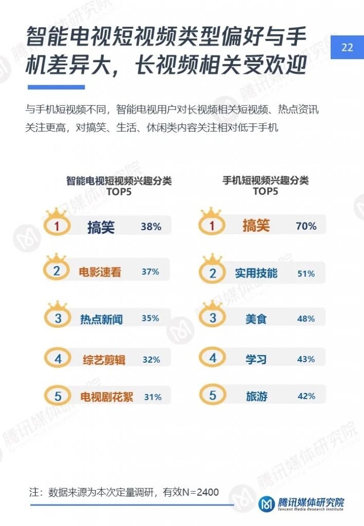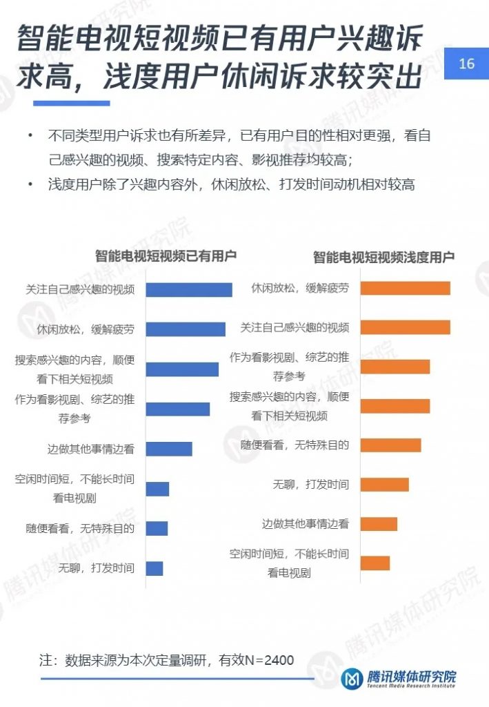 1、智能电视侧短视频用户呈成熟、高端、家庭特点,对短视频诉求与手机差异大,对于优质、实用内容更关注