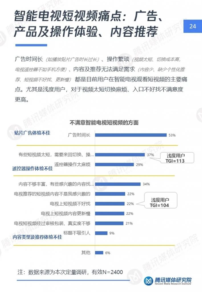 2、智能电视侧短视频产品在广告、产品及操作体验、内容推荐方面需重点提升