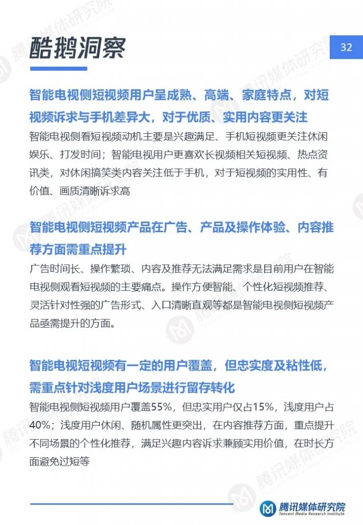 广告时间长、操作繁琐、内容及推荐无法满足需求是目前用户在智能电视侧观看短视频的主要痛点。操作方便智能、个性化短视频推荐、灵活针对性强的广告形式、入口清晰直观等都是智能电视侧短视频产品亟需提升的方面。