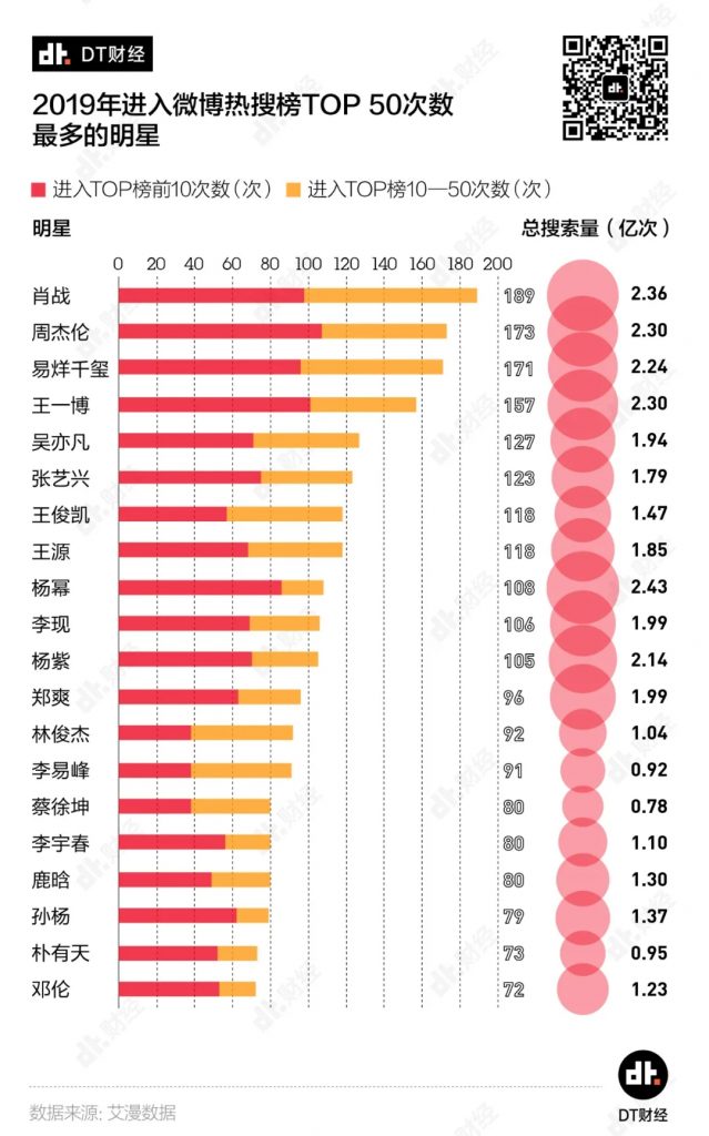 DT君统计了每个明星进入话题热搜榜单TOP 50的次数,找到了2019年上热搜最多的20个明星。