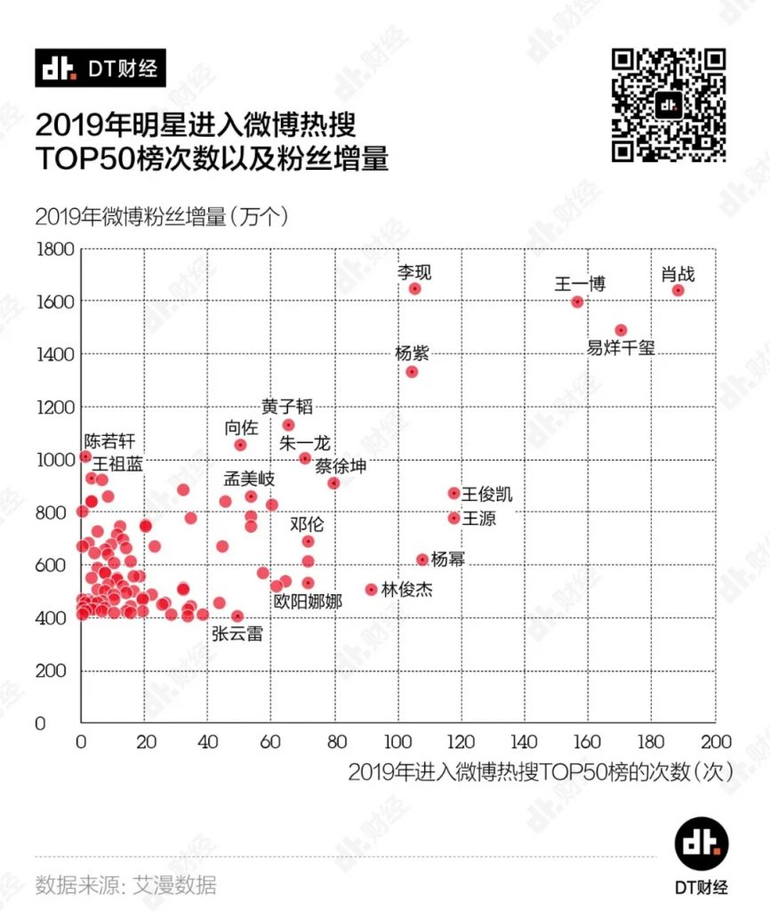 在统计了2019年涨粉最多的100个明星之后,DT君再结合他们登上热搜榜的次数,发现去年涨粉最多的明星的确包含了那些热搜榜的常客,比如李现(涨粉1637.7万)、肖战(涨粉1636.8万)、王一博(1589.1万)、易烊千玺(1483.3万)、杨紫(1326.1万)、黄子韬(1122.2万)、向佐(1050.5万)等等。