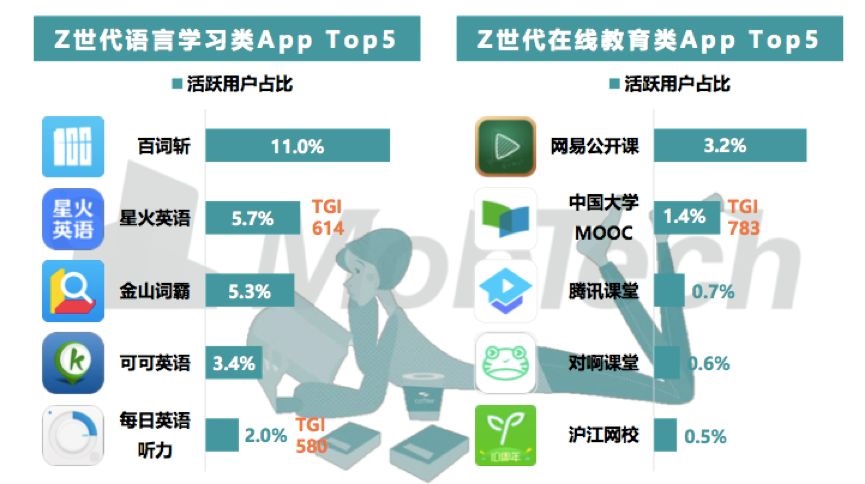 Z世代学习应用更加多元,但相较于泛娱类应用,学习类APP在Z世代的人群中更加垂直,有更精准的用户属性。