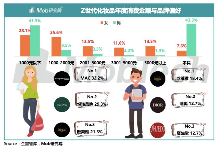 美妆品类在Z世代主要消费品中渗透率最高。MAC、悦诗风吟和欧莱雅是Z世代女性最爱的美妆品牌。