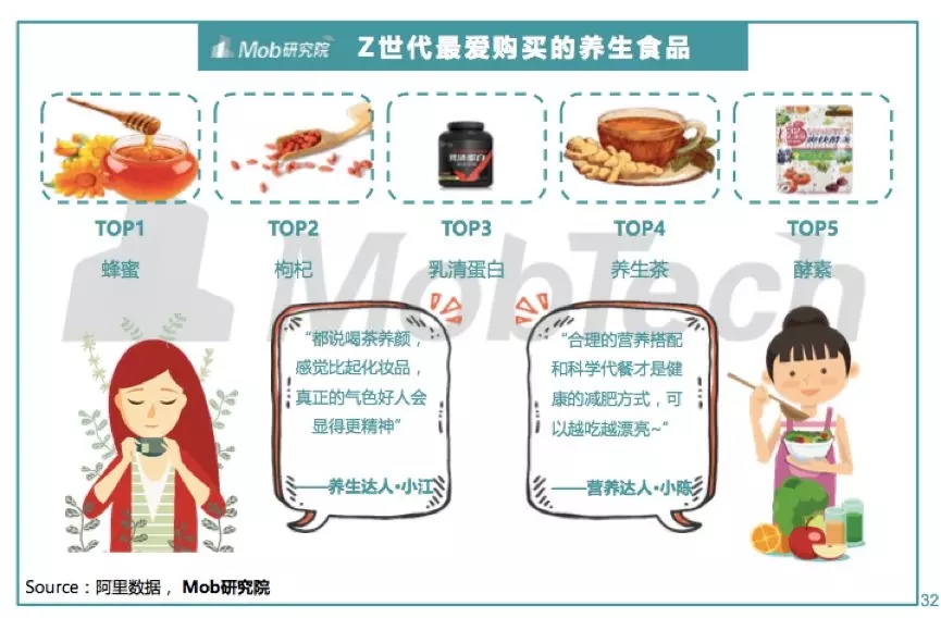 他们有更强的健康意识,注重饮食和运动结合来达到养生的目的,最喜欢购买的养生食品是蜂蜜、枸杞、乳清蛋白、养生茶和酵素。