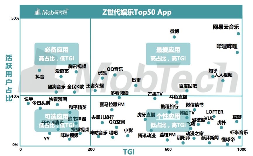 在Z世代大学生最常用的50款娱乐App中,普遍受拥趸的手机应用数量较少,网易云音乐和B站是个两个异数,受到大多数的欢迎。因为Z世代最爱聚合类内容,而这两个平台都是典型。