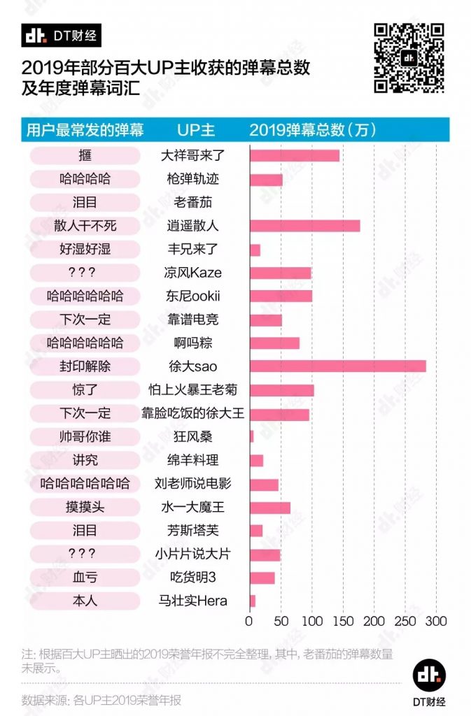 于是我们找到B站UP主的荣誉年报,整理了部分头部UP主视频中最常出现的弹幕。