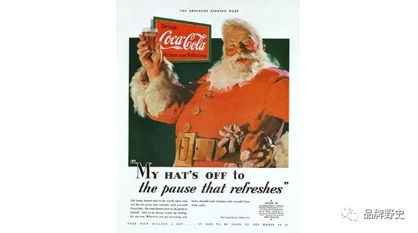 于是在《星期六晚报》上诞生了首张圣诞老人形象,一位身着红色长袍、白色大胡子、永远面带笑容的老人形象,他一手摘下帽子,一手举起一杯可口可乐,念出了那句自1929年推出的著名广告语:“The Pause That Refreshes(享受清凉一刻)”