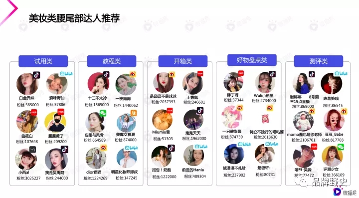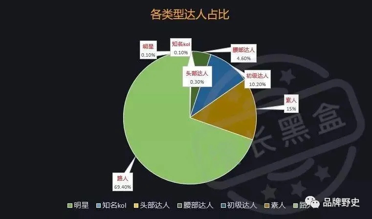 微信公众号增长黑盒Growthbox在2019年8月底发布了一篇爆款文章《通过数据挖掘,我们研究了完美日记的两大增长策略》[1],研究了完美日记在小红书、抖音、微博等18-28岁女性用户群集中的主战场投放情况,明星(认证,如朱正廷)、知名KOL(加v认证,如:李佳琦)、头部达人(粉丝数>50万)、腰部达人(5万<粉丝数<50万)、初级达人(5000<粉丝数<5万)、素人(300<粉丝数<5000)的比例是1:1:3:46:100:150,完美日记并非是一味在寻求大牌明星的代言,而是广泛投放腰部以下的小众KOL。