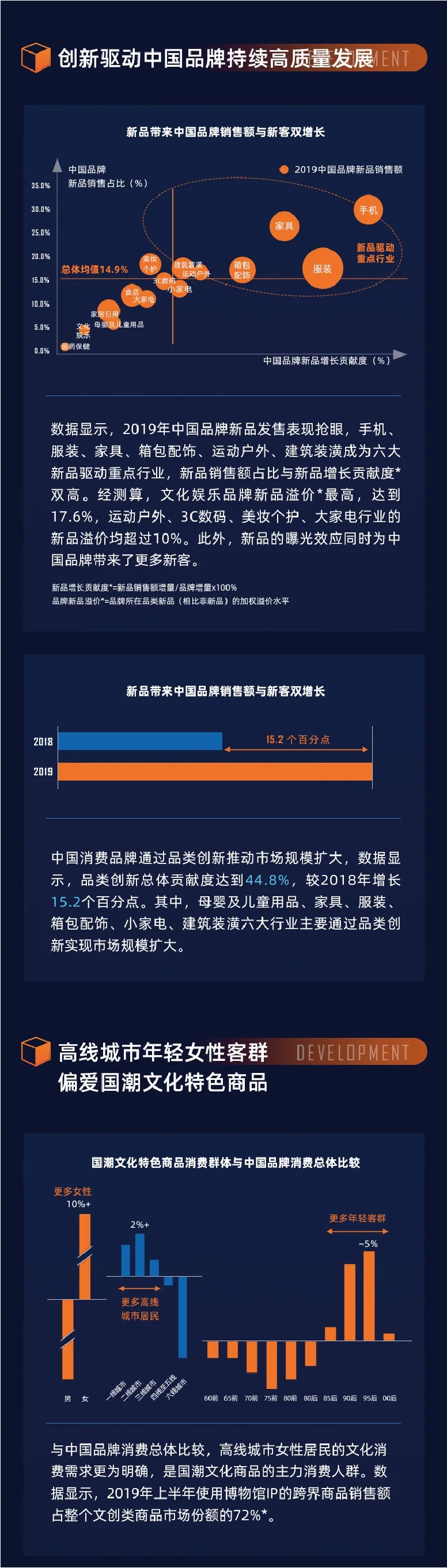 趋势二:创新驱动中国品牌持续高质量发展,品类创新对市场规模扩大的贡献度比上年提升了15.2个百分点,2019年达到44.8%。