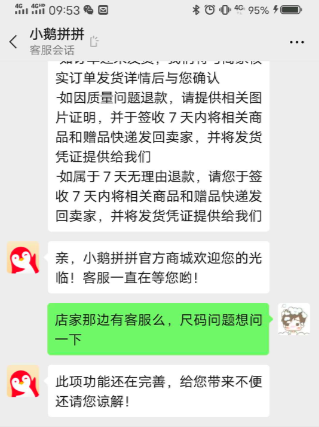 对此,TechWeb咨询了小鹅拼拼的官方客服,得到的回答是:此项功能还在完善。一位不愿透露姓名的商家告诉TechWeb,一开始我们也是感到很奇怪,但是这样也好,省去了客服成本,也省得跟买家扯皮,喜欢就买,不喜欢就退货。