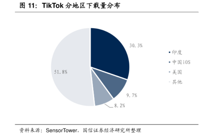 SenserTower 数据显示,美国用户占据了全球用户的约 8.2%。在美国,TikTok 的下载量已经超 1.65 亿次,约占其总人口的 50%;每月有 6500 万-8000 万活跃用户,TikTok 18 岁以上用户每月累计浏览时长高达 858 分钟。