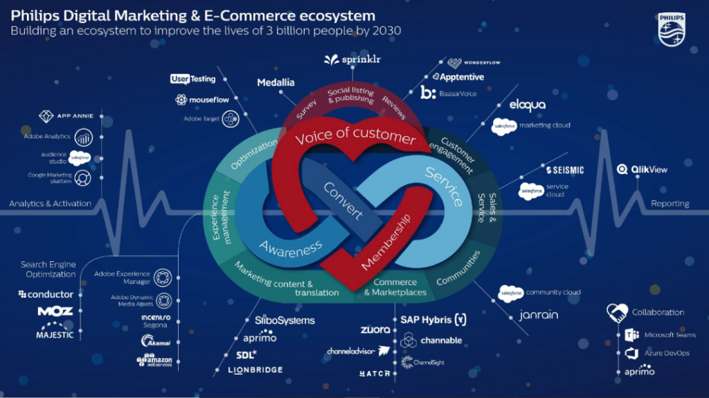█ 营销应用层,直接面向消费者的一系列解决方案,包括营销模块、分析模块、广告模块、电子商务模块,每个模块都有细分解决方案和产品工具。