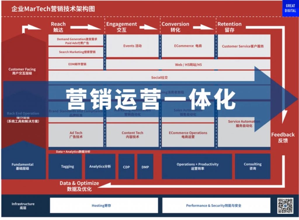 这张图的价值在于,它不再是从工具角度出发,而是着眼于企业实际的营销工作:沿着触达-交互-转化-留存的消费者旅程脉络,即图片从左至右的每一个关键营销阶段,自下而上探寻企业需要哪些营销技术基础设施和应用方案。