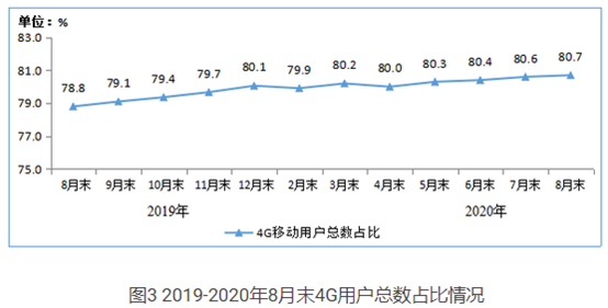 工信部公布了2020年1-8月通信业经济运行情况。数据显示,截至8月末,三家基础电信企业的4G用户数为12.9亿户,同比增长2.6%;1-8月,移动互联网累计流量达1039亿GB,同比增长33.7%。