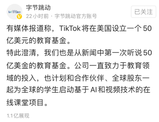 传言四、关于总额为50亿美元的教育基金。