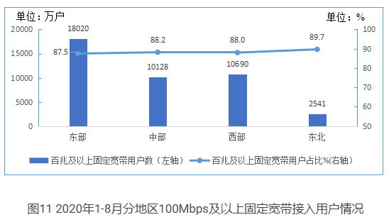 - 东北地区百兆及以上固定宽带接入用户渗透率领先。