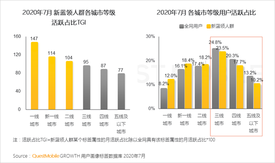 4、一二线城市市场需求巨大、机会更多,新蓝领人群活跃度更高;随着市场消费下沉,三线及以下城市新蓝领人群蕴含有巨大的职业增长潜力