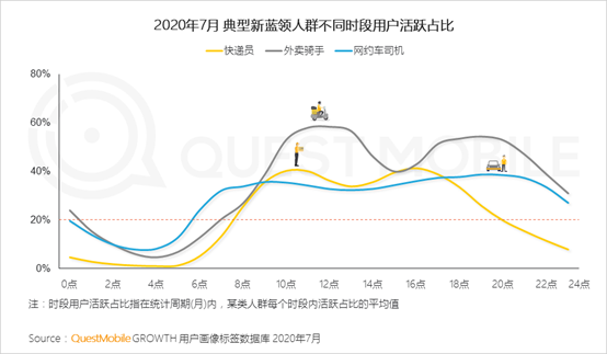 7、快递员工作时间相对稳定,以早8点至晚8点为主;外卖骑手与用户用餐需求高度匹配,在午饭和晚饭阶段为工作高峰;网约车司机活跃时间相对较长,从早6点一直持续到凌晨0点