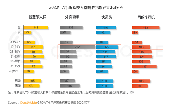 8、新蓝领人群多为男性,其中快递员,尤其是外卖骑手更偏向年轻未婚人群,网约车司机则多为年长已婚人士