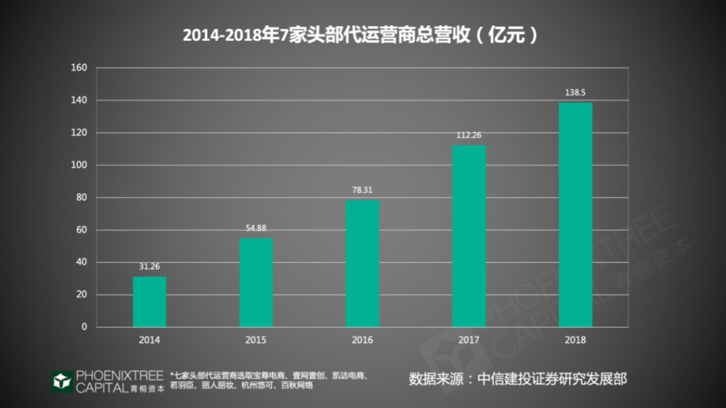 头部代运营企业总体营收呈高速增长,据中信建投证券统计,7家头部企业,包括宝尊、壹网壹创、凯诘电商等,2018年营收累计达138.5亿元,5年的年复合增长率超45%。