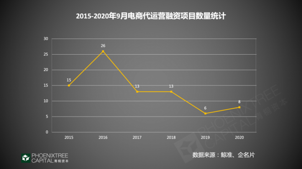 纵观2015-2020年9月电商代运营融资情况,获得融资的项目数量于2015年开始攀升,2016年达到峰值,随后开始下降;2020年有所回升,共8个项目获得融资。