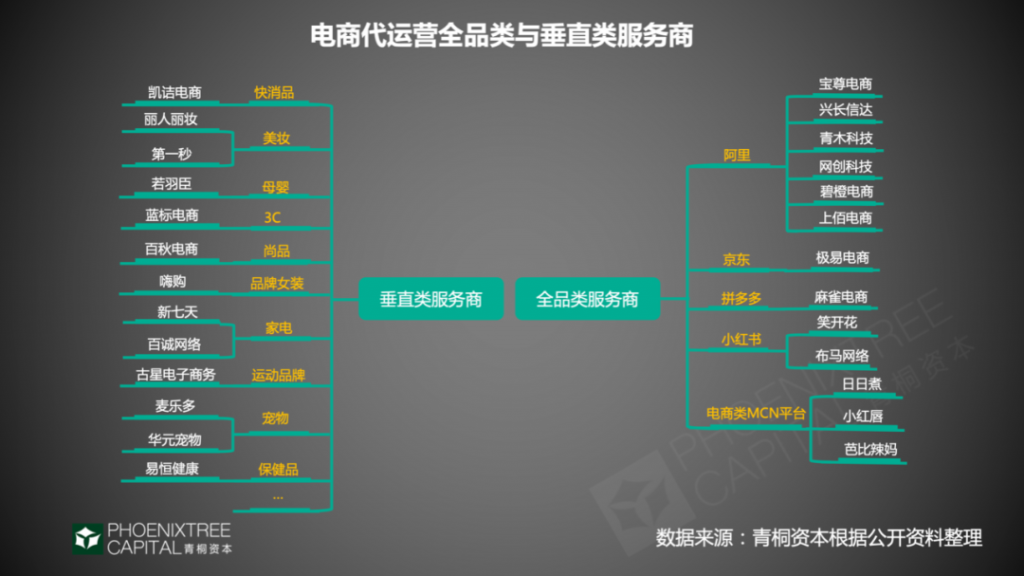 按服务覆盖品类,代运营企业可分为2大类:全品类、垂直类。青桐资本研究发现,从头部代运营企业来看,垂直类数量多于全品类,全品类以宝尊电商为代表,垂直类有丽人丽妆、壹网壹创、若羽臣等。