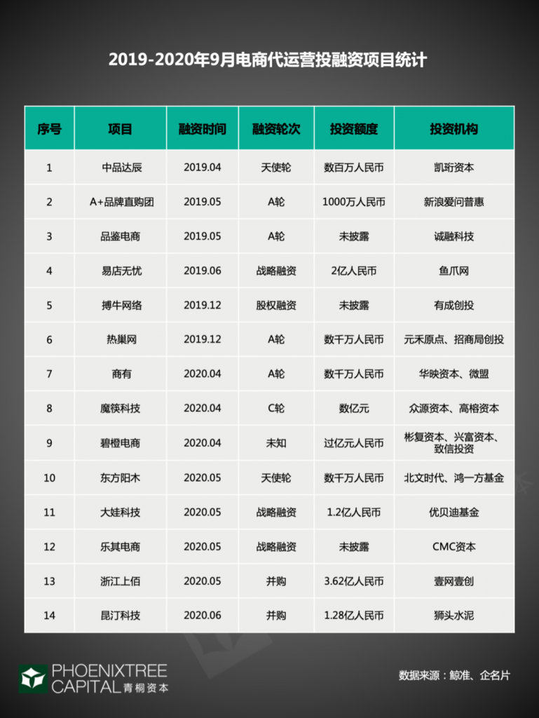 平台战投背书也是一大融资特点。阿里先后战略投资宝尊电商、丽人丽妆、沃天下供应链等代运营企业;京东于2018年战略投资ecMAX极易电商,发展其服务商生态。