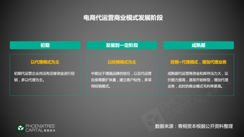成熟代运营企业一般经历3个发展阶段初期以代理为主,因为缺乏资金做经销。发展到一定阶段,出于增加客户粘性、扩体量的考虑,增加经销业务比重。到成熟期,两者并存,代理业务比重增加,从而减轻库存、资金压力,增加毛利,同时议价能力提高。