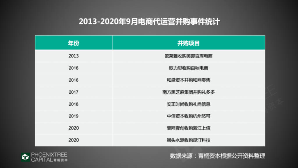 并购成为代运营资本化另一大路径。青桐资本统计发现,2013-2020年9月共有8起并购,其中5起,欧莱雅、歌力思、南方黑芝麻、安正时尚、壹网壹创都是业务导向的产业链整合。