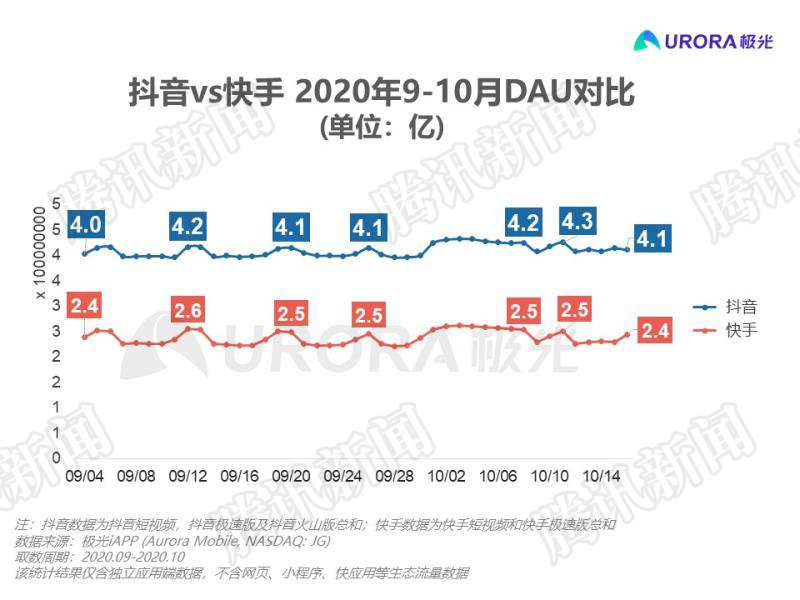 第三方机构极光的监控数据显示,2020年9月以来,抖音(含极速版、火山版)平均日活4.08亿,快手(含极速版)2.37亿。
