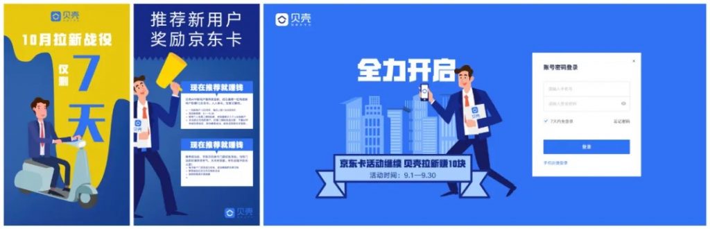 为了达到这个目的,贝壳在营销表达上选择了IP插画的方式去将经纪人这个角色具像化,通过略带诙谐的卡通形象去强化品牌、经纪人和C端用户之间的情感连接。