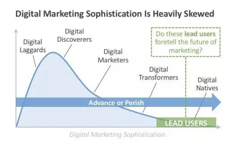 如果我们把这些数字原住民公司看作是在数字营销前沿探索的先锋(lead users),那么理所应当的,最终其他公司也会跟随他们的脚步。每个人要不沿着这条曲线进步,要不就冒着被颠覆的风险。