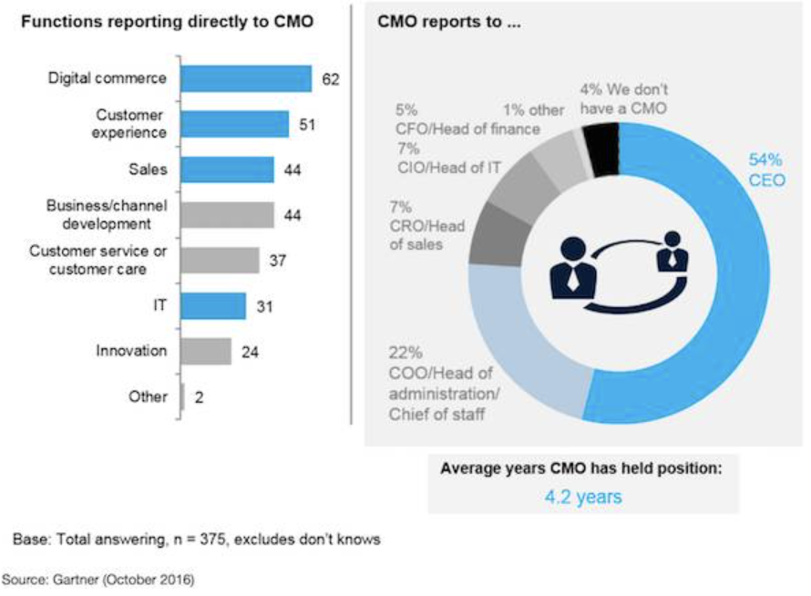第一种选项是那些有首席数字官 (CDO) 或者首席客户官 (CCO) 负责客户体验(或是 CMO 明确对数字化商业/客户体验负责)的公司正在发生的情况。根据知名 IT 咨询公司 Gartner 最近发布的 CMO 报告,这也是多数大公司的选择。