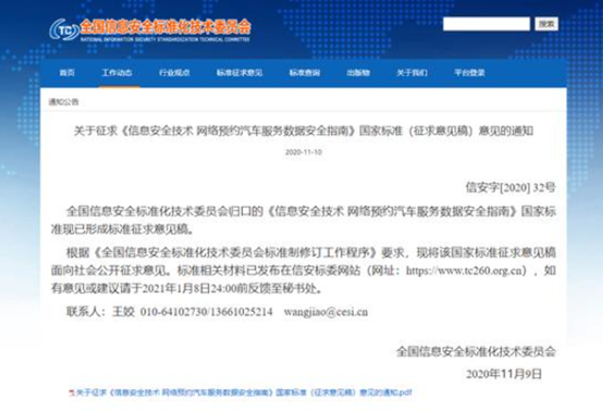 据全国信息安全标准化技术委员会11月10日官网消息,国家标准《信息安全技术网络预约汽车服务数据安全指南》征求意见稿出台。