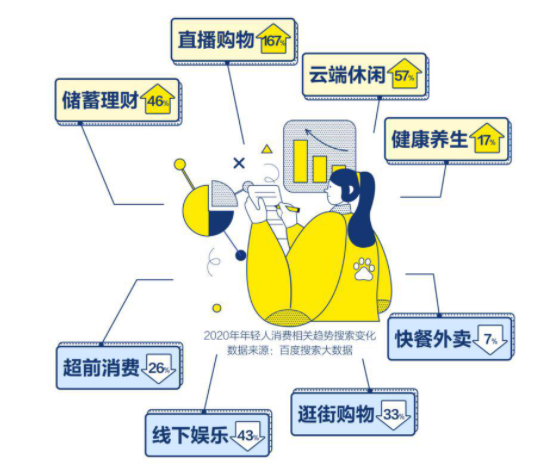 百度搜索大数据显示,2020年,年轻人消费相关趋势发生了十分明显的变化,直播购物和储蓄理财分别上涨167%、46%,云端休闲与健康养生分别上涨57%、17%。开源节流、未雨绸缪成为他们今年热捧的生活哲学。