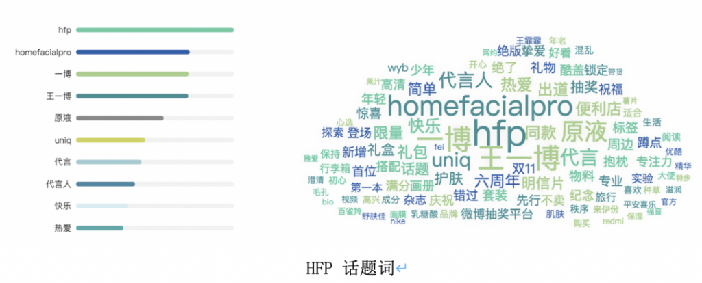 从HFP的话题词可以看出,“王一博”、“同款”、“热爱”已经和品牌词“HFP”、“原液”等形成强绑定。通过频繁合作明星联动热搜,HFP成功撬动了粉丝力量,在微博种出一片草原,既收割了流量,也获得了声量,可谓一举两得。